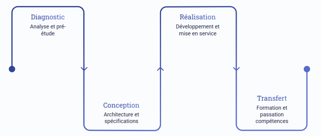 Notre approche intégrée garantit une continuité de service à chaque étape, depuis l’analyse fonctionnelle jusqu’à l’assistance à l’exploitation, minimisant les interruptions de production.
